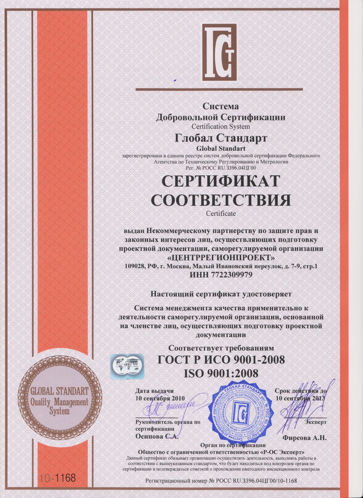 10 сентября 2010г. НП СРО «ЦентрРегион» и НП СРО «ЦентрРегионПроект» получили сертификаты соответствия систем менеджмента качества международным стандартам ISO 9001:2008. Это первые в России саморегулируемые организации в области строительства и проектирования, прошедшие добровольную сертификацию систем менеджмента качества.