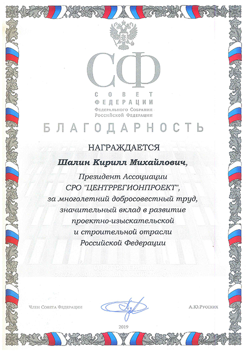 Президент Ассоциации СРО «ЦЕНТРРЕГИОНПРОЕКТ» Кирилл Михайлович Шалин получил из рук члена Совета Федерации Московской области Алексея Русских благодарственное письмо Совета Федерации «За многолетний добросовестный труд, значительный вклад в развитие проектно-изыскательской и строительной отрасли Российской Федерации».